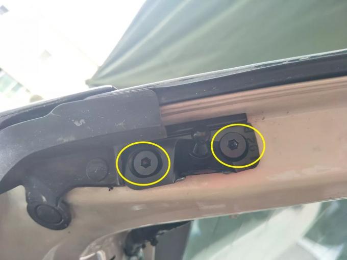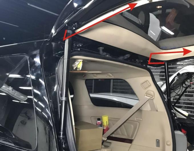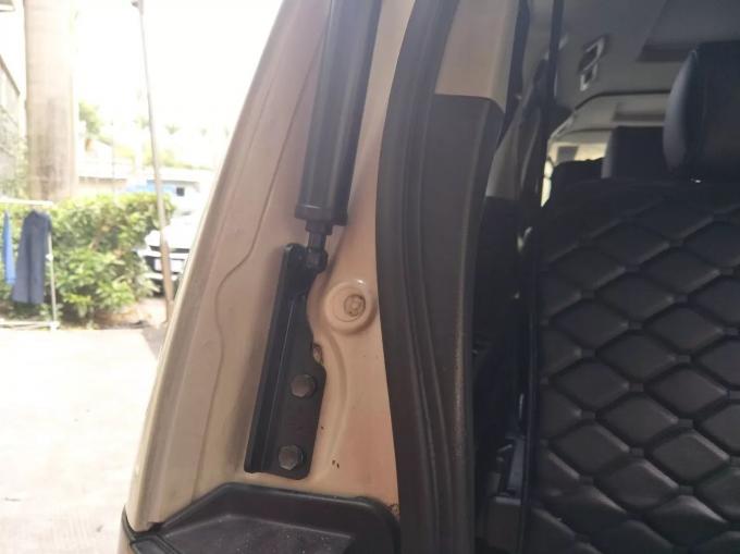 7. Tháo khung phía trên bên trái của chiếc xe nguyên bản, Lắp đặt móc trên bên trái và cực của bộ nâng cổng sau điện của chúng tôi (cực có đường thẳng lên trên), Vít cố định bằng các vít của chúng tôi.